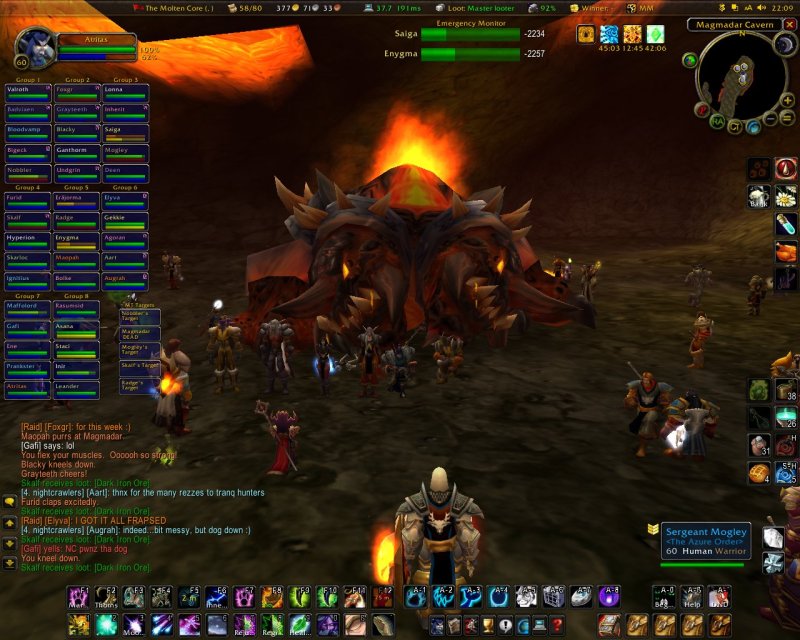 You can see all groups on the left side, the main tanks on bottom left, who is buffed with MotW (tiny purple paw in top right corner of the player-frames), health/mana/energy/rage status, classes (color-coded: white=priest, yellow=rogue, ...) and the triggered emergency monitor.